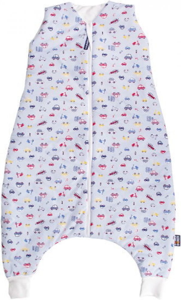 Světlemodrý spací pytel v délce 110 cm s motivem autíček a s otvory pro nohy