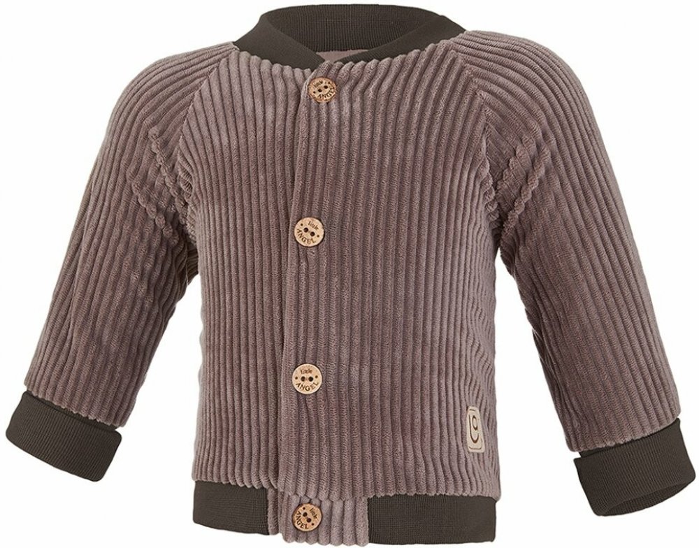 Kabátek je módního střihu, zapíná se pomocí knoflíčků Little Angel® z přírodního materiálu a rukávky kabátku lze ohrnout do manžety. Materiál kabátku je velmi