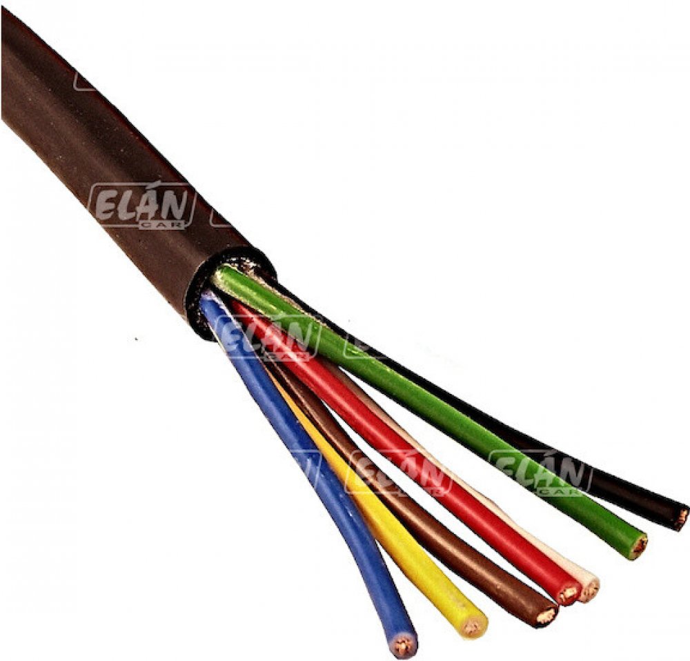 Ohebný sedmižilový vodič CYA H07V-K pro vnitřní vedení, pro přístrojové vedení a rozvodné stanice, autoelektriku. Použití: Vodič je určen pro elektoinstalaci přivěsných vozíků a tažných přívěsů. Konstrukce jádra: Měděné jádro z jemných drátků Izolace žil: PVC Barvy žil: Černá, rudá, hnědá, modrá, zelená, žlutá, bílá Izolace pláště: PVC Průměr kabelu: 12 mm Průřez jádra: 7 x 1,5 mm2 Množství: prode...