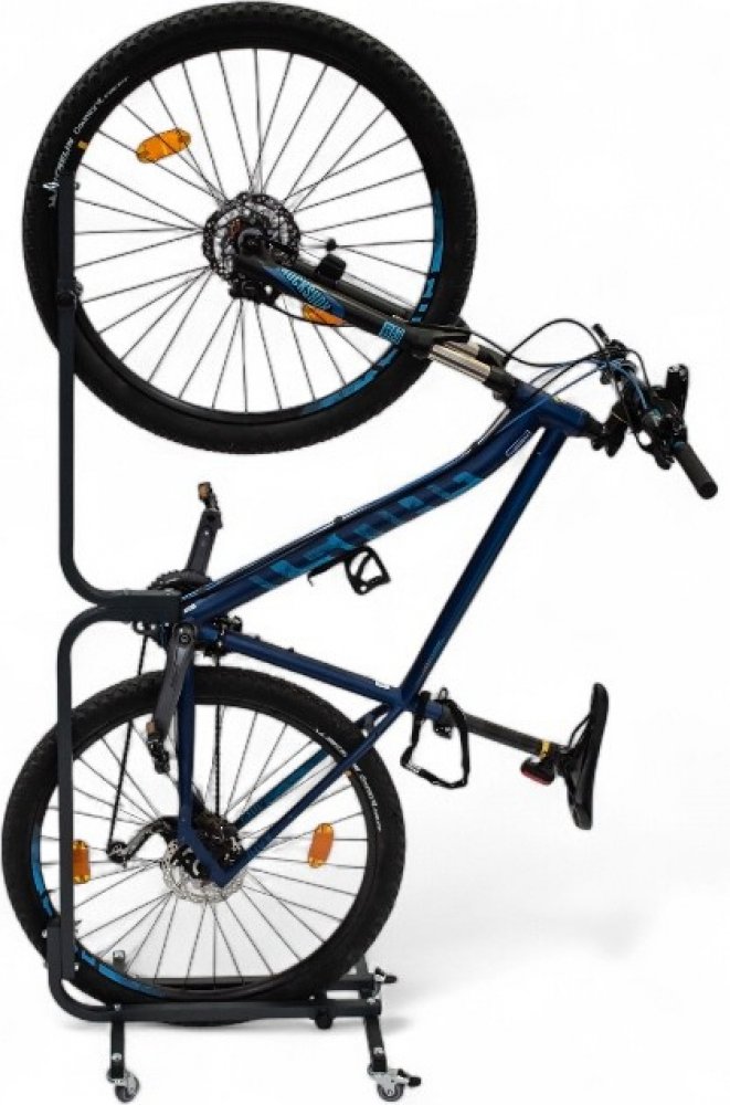 - Stojan je mobilní, takže se s kolem se dá ve stojanu volně přejíždět (např. v bytě, na balkóně, ve sklepě nebo zajet do výtahu)