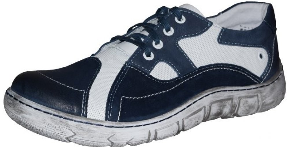 Dámská volnočasová obuv Kacper je v kombinaci bílé a modré barvy. Bílý svršek má ražený povrch, na modrém svršku vyniká bílé prošívání. Obuv je pohodlná a komfortní díky celokoženému provedení a flexibilní podešvi. Stélka má perforování pro lepší klima chodidla.