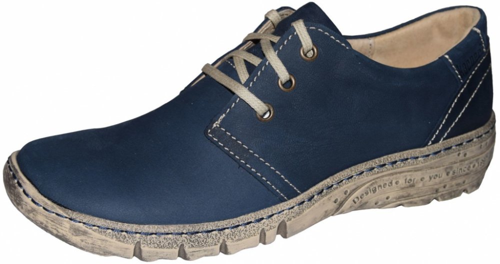 Dámská vycházková obuv Kacper na šněrování v modré barvě je v celokoženém provedení. Svršek je s prošíváním a raženým logem Kacper u paty. Je pohodlná díky měkké kožené stélce i podšívce a flexibilní podešvi. Stélka má perforování pro dobré klima chodidla. Podešev má vzhled se stíraným povrchem a popisem.