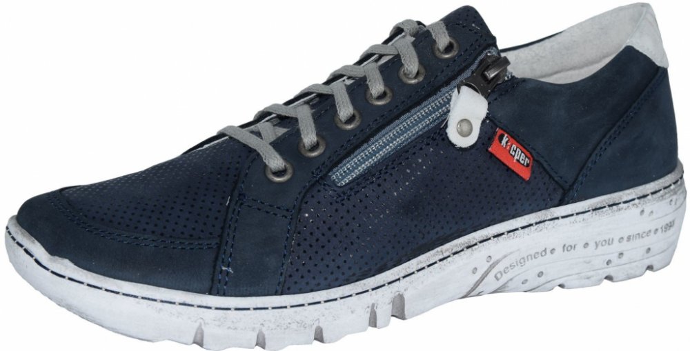 Dámská obuv Kacper je v zajímavém designu. Svršek je z části zdobený jemnými tečkami, originální je podešev, šikmý zip dotváří hezký vzhled a usnadní nazouvání. Jsou v komfortním celokoženém provedení se stélkou tlumící došlap, podešev je flexibilní.