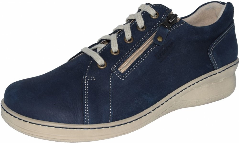 Dámská obuv Kacper v tmavě modrém odstínu má šikmý zip, který usnadní nazouvání. Jsou v komfortním celokoženém provedení se stélkou tlumící došlap, podešev je s mírným klínkem.