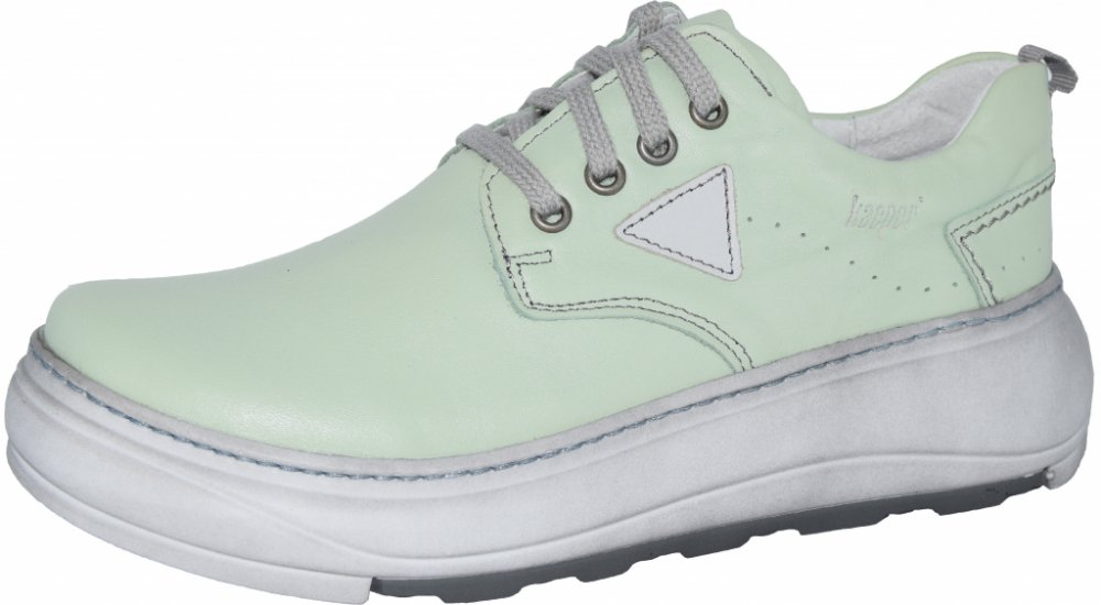 Dámská obuv Kacper se vyznačuje silnější podešví se svrškem v jemně zeleném odstínu. Samozřejmostí je celokožené provedení a stélka tlumící došlap.
