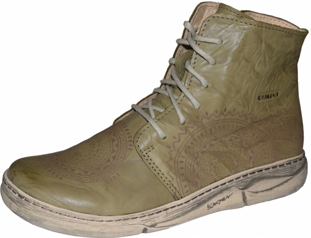 Kožený svršek v zeleném odstínu khaki je ozdobený potiskem. Nohy budou v teple díky silnému kožíšku na podšívce i stélce. Šněrování na nártu doplňuje zip na vnitřní straně a proto noha vklouzne snadněji. Standardní je flexibilní provedení podešve se stíraným povrchem.