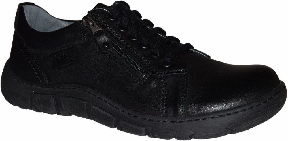 Pánská kožená vycházková obuv Kacper má svršek v černém odstínu, který se snadno kombinuje. Má šněrování, ale i šikmý zip na boku pro snadnější obouvání. Obuv je pohodlná díky měkké kožené podšívce i stélce, která má perforaci. Podešev s vyšším okrajem je přesto velice flexibilní.