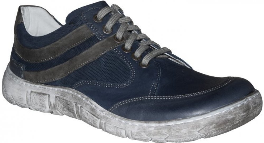 Pánská kožená vycházková obuv Kacper na šněrování je v modré barvě s ozdobnými pásky a jemně raženým vzorem na vnější a vnitřní straně. Pohodlí a komfort poskytne měkká kožená podšívka i stélka, která má perforaci pro dobrou cirkulaci vzduchu. Vzhledem masivní podešev se stíraným povrchem je přesto velice flexibilní.
