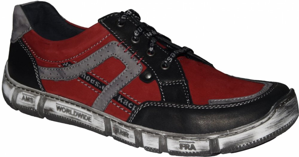 Pánská vycházková obuv v celokoženém provedení má designově zajímavý vzhled díky barevnému provedení s různými popisy. Obuv je také pohodlná, stélka má perforování pro lepší klima chodidla, podešev má originální design se stíraným povrchem.
