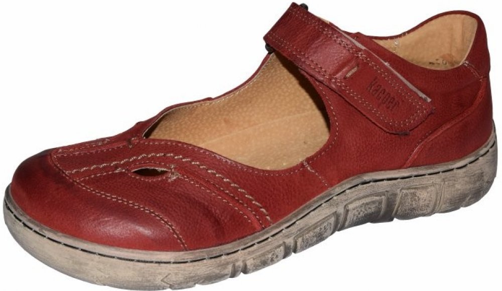 Dámská letní vycházková obuv Kacper je vyrobena z pravé přírodní kůže. Červený svršek obuvi je zdoben prošíváním. Přes nárt je pásek se zapínáním na suchý zip. Nohy se budou cítit pohodlně díky měkké polstrované stélce s perforováním, které přispívá k cirkulaci vzduchu a dobrému klimatu chodidla. Flexibilní podešev má stíraný povrch.