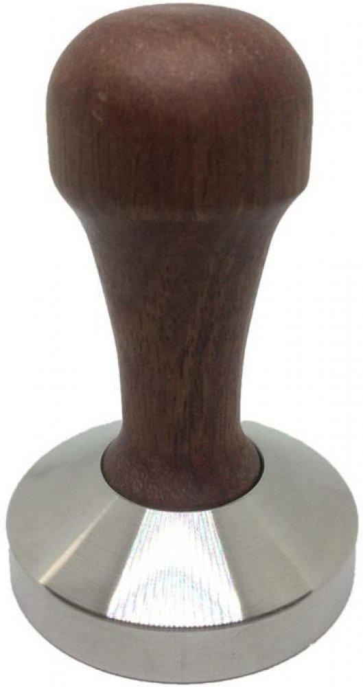 Profesionální tamper flat má plochou kovovou základnu a ergonomickou dřevěnou rukojeť a jeho váha je 340g.