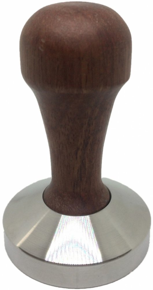Profesionální tamper flat má plochou kovovou základnu a ergonomickou dřevěnou rukojeť a jeho váha je 370g.