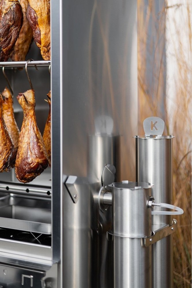 Dým do udírny proudí přes filtrační válec, který z kouře odlučuje nežádoucí látky. kouř se zároveň ochlazuje a udírna je tak vhodná i pro uzení studeným kouřem.
