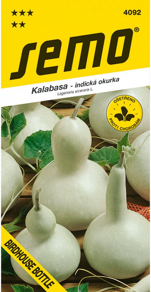 BIRDHOUSE BOTTLE – je odrůda Lagenárie neboli kalabasy, česky zvané Indická okurka, která patří k vděčným, bujně rostoucím popínavým druhům tykví. Jedná se o u nás méně známou jednoletou rostlinu s popínavou lodyhou a světle zelenými listy. Plody mají hruškovitý tvar a dorůstají velikosti 20 - 30 cm.