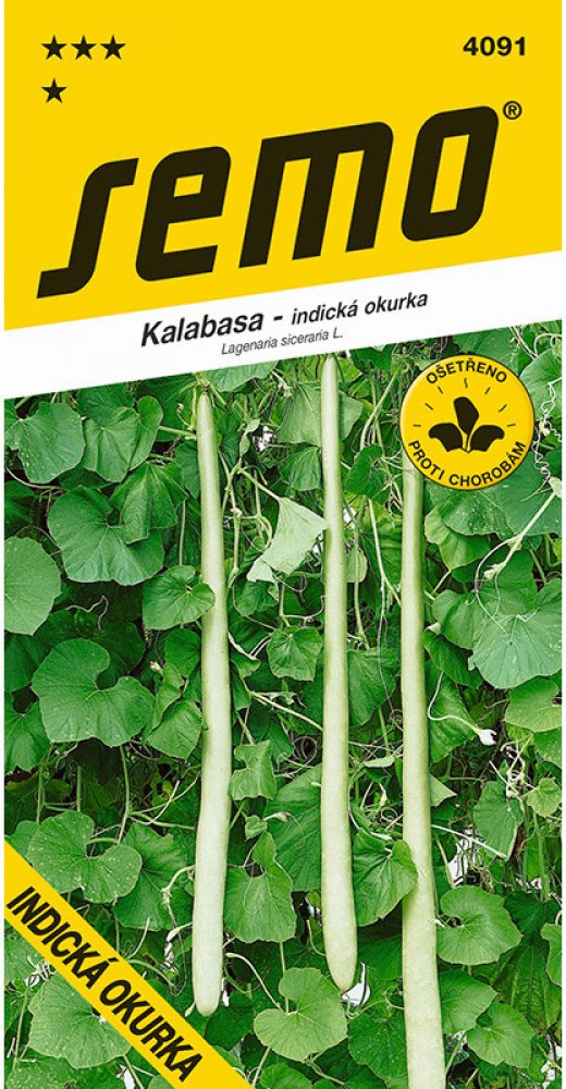 KALABASA – Lagenárie neboli kalabasa, česky zvaná Indická okurka patří k vděčným, bujně rostoucím popínavým druhům tykví. Jedná se o u nás méně známou jednoletou rostlinu s popínavou lodyhou a světle zelenými, většinou srdčitými nebo ledvinovitými listy. Indická okurka kvete bílými květy na dlouhých stopkách. Plody jsou válcovité, dužnaté bobule dorůstající délky 0,3 - 1,5 m.