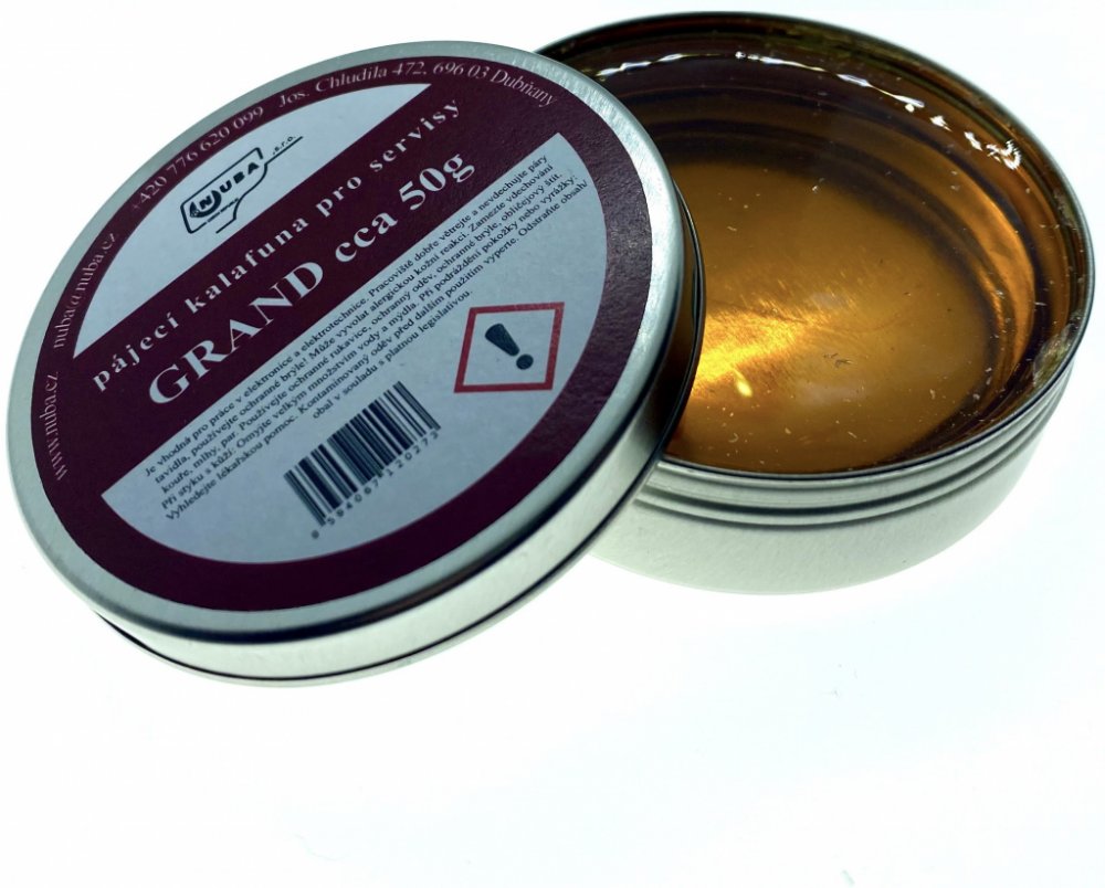 Pájecí kalafuna české výroby GRAND je vylepšeným druhem kalafuny, obohacené o tavidlo MTL 408. Velké balení je určené například pro servisy. Je vhodná pro práce v elektrotechnice a elektronice při pájení i mírně znečištěných spojů. Osvědčila se jak u začátečníků - kutilů, tak zejména u prosionálních pracovníků, neboť pájení s kalafunou GRAND je snažší a úspěšnější.