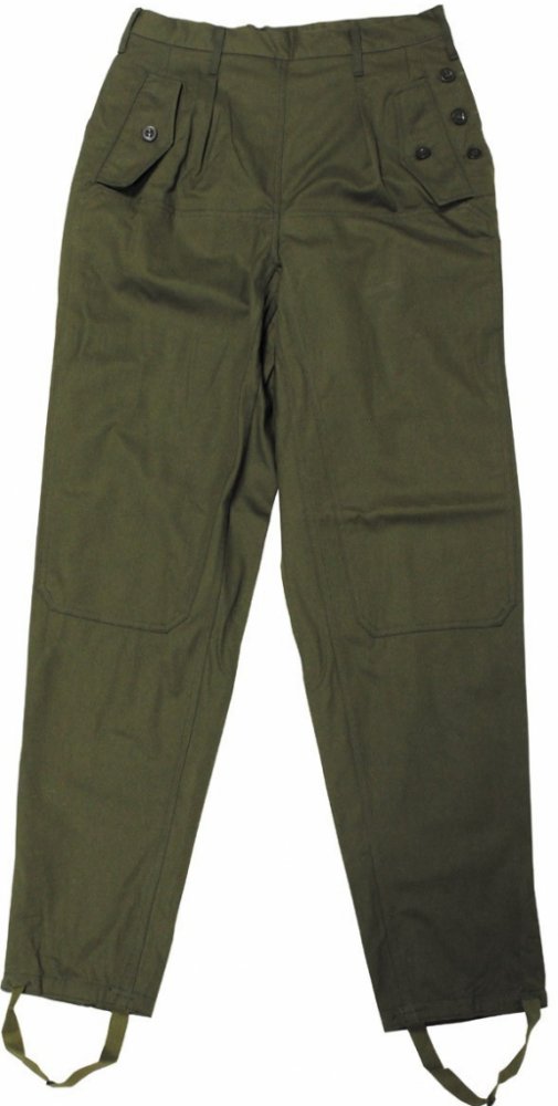 Nové kalhoty z výprodeje AČR. Vzor 85. Zvýšený sed. Zapínaní na knoflíky. Dvě boční velké skládané stehenní kapsy s klopou na knoflíky. Dvě zadní kapsy. Dvě kapsy na ruce. Tkanice na stažení nohavic.