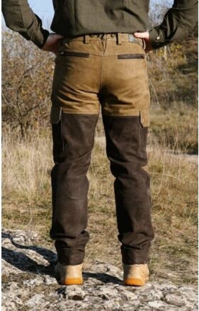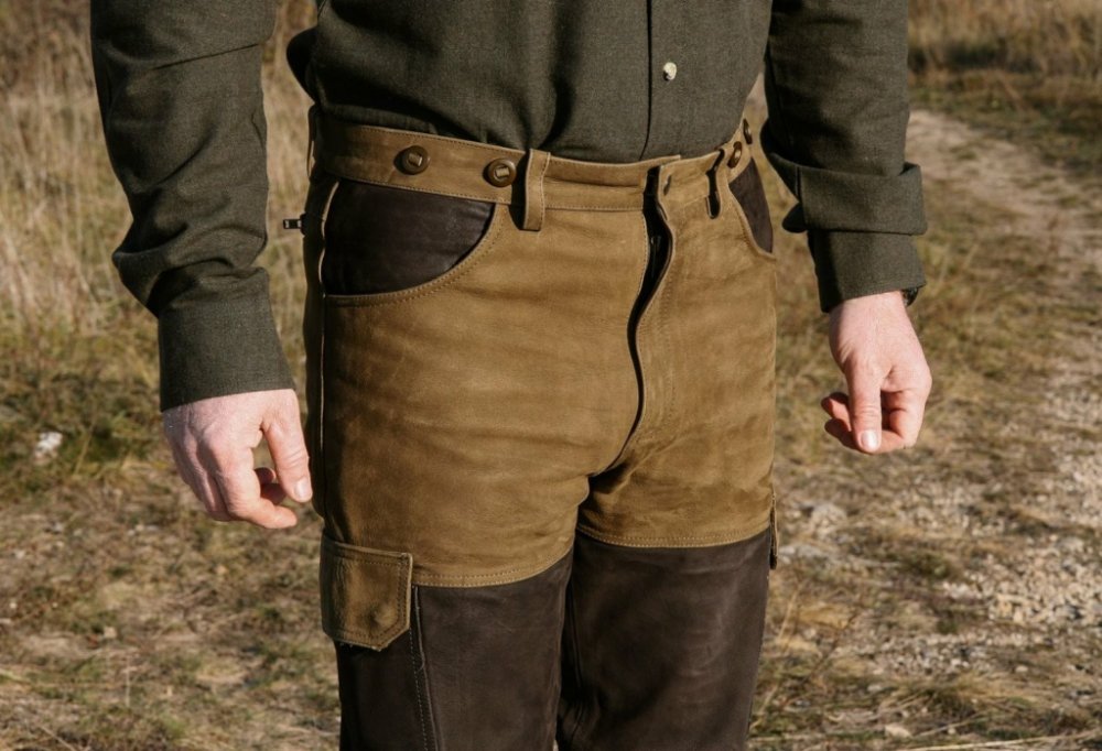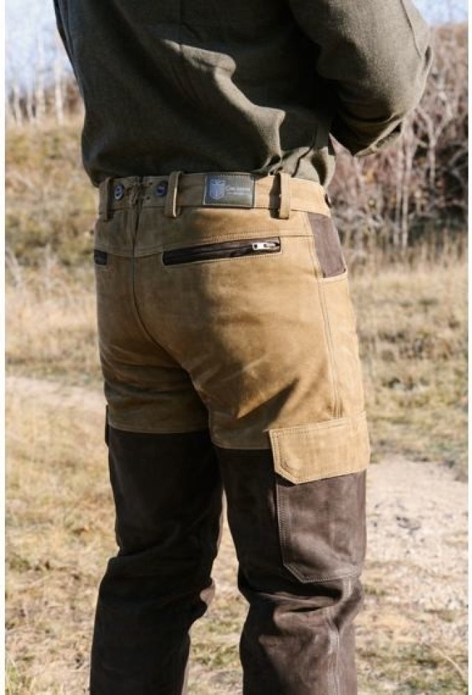 Kalhoty z pevné, robustní 100% buvolí kůže, vypodšívkované (100% polyester) téměř po celé délce. V pase zapínání na dva pevné knoflíky. Délka se upravuje jednoduchým zastřižením.