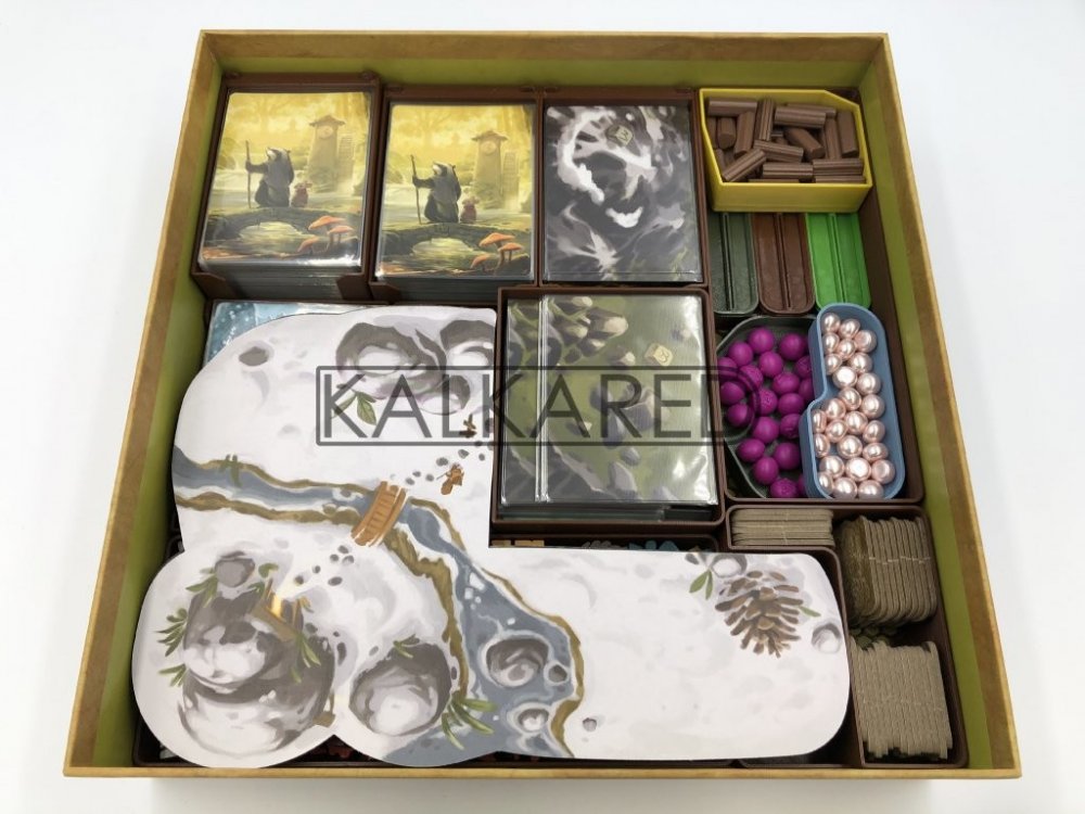 Podporuje obaly na karty s tloušťkou 80 mikronů (FFG, Mayday, Diamond, Paladin, Board Game Sleeves, atd.)- poznámka k obalům: Karty se do insertu v těchto obalech vejdou, jde ale o velmi těsné uložení. Zejména pokud jsou obaly nové a ještě nezapracované. Pokud můžete, obalte karty Skalověží do tenčích obalů, čímž bude rozložení jednodušší.
