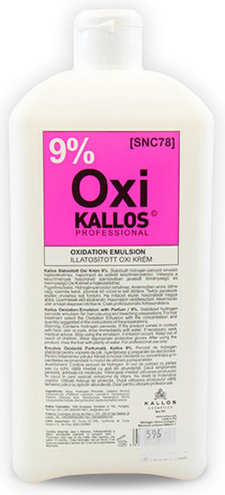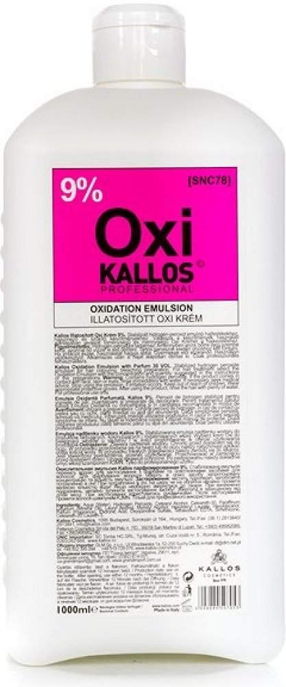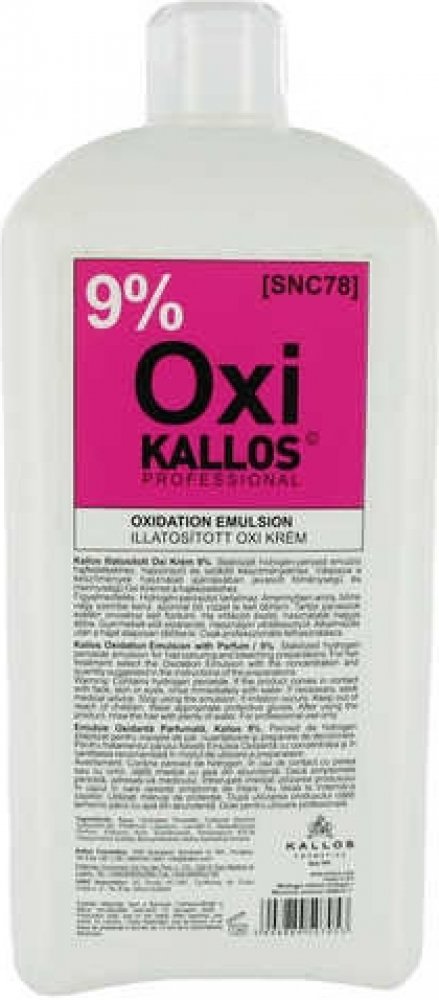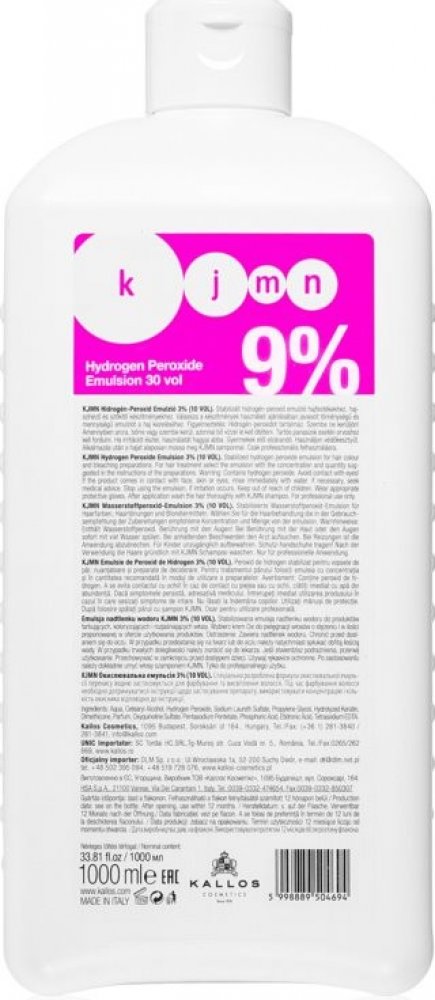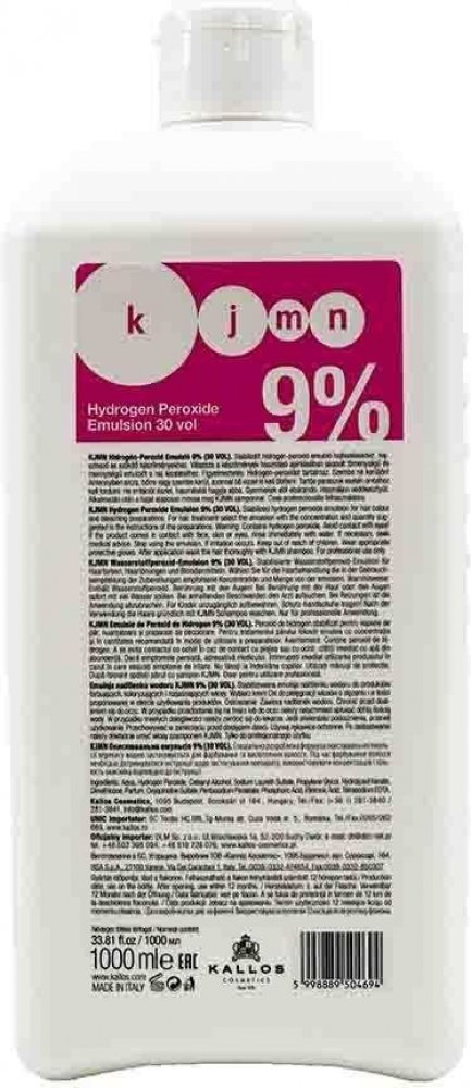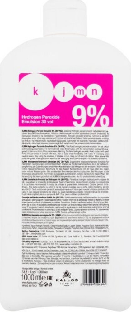 Kallos Kjmn Hydrogen Peroxide Emulsion- 9% / 30 Vol. 1000 ml. Oxidační emulze. Použití: Smíchejte dle doporučeného poměru uvedeném na barvě nebo zesvětlujícím prášku Kallos. Upozornění: Pouze pro profesionální použití. Vyrobeno viz etiketa / Kat. č. KA0101