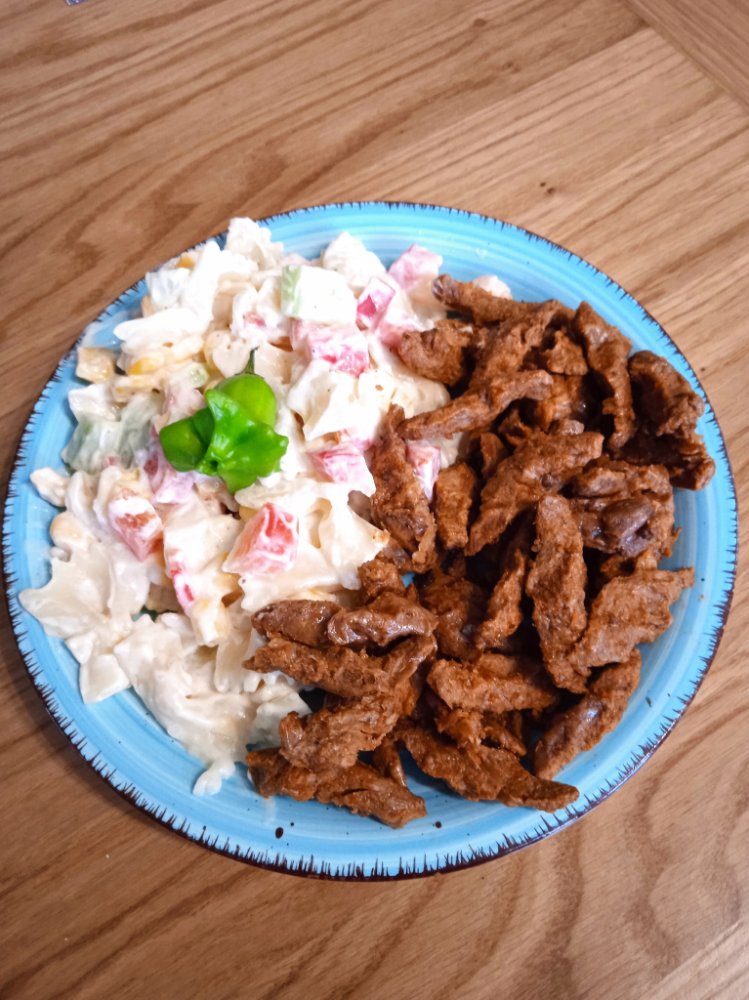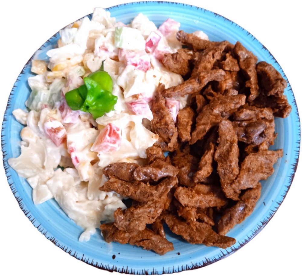 Složení: pitná voda, sójová bílkovina, olej rostlinný řepkový, kukuřičný škrob, rajčata, sójová omáčka (voda, fermentovaná sója, fermentovaná pšenice, sůl, přírodní aroma), pšeničná bílkovina, aroma, glukózový sirup, kvasničný extrakt, extrakt koření.