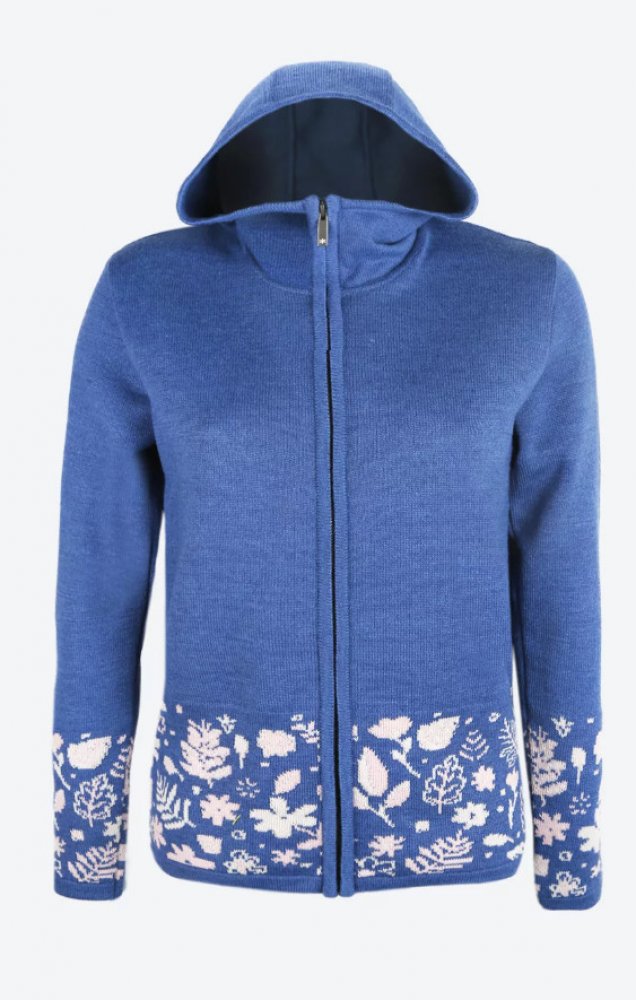 Kama 5049: osobitý dámský svetr s kapucí zdobí květinový motiv u spodního okraje těla a rukávů. Je středně teplý a hodí se k běžnému nošení.