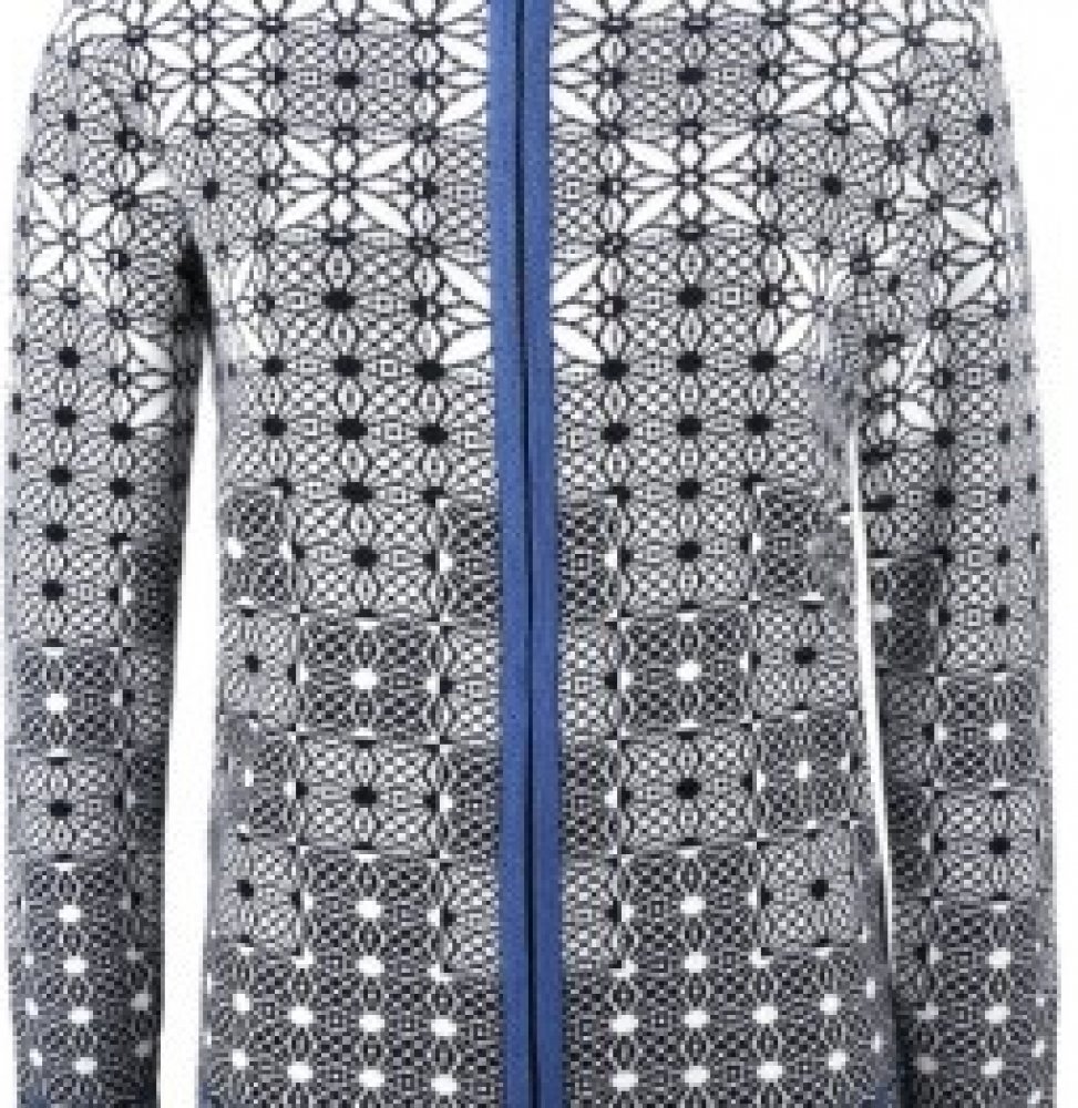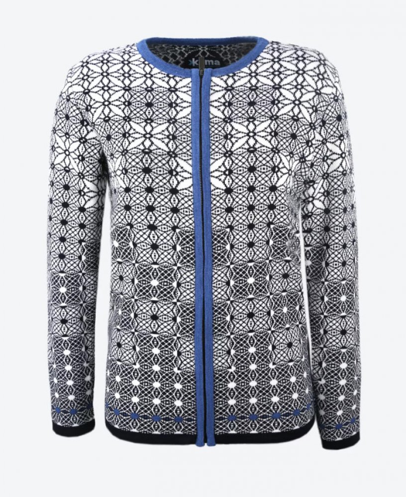 Kama 5055: lehký dámský celorozepínací svetr z kvalitní příze. Svetr s barevným lemem má zapínání na dlouhý zip a je ozdobený drobným originálním vzorem. Hodí se k sukni i sportovním kalhotám.