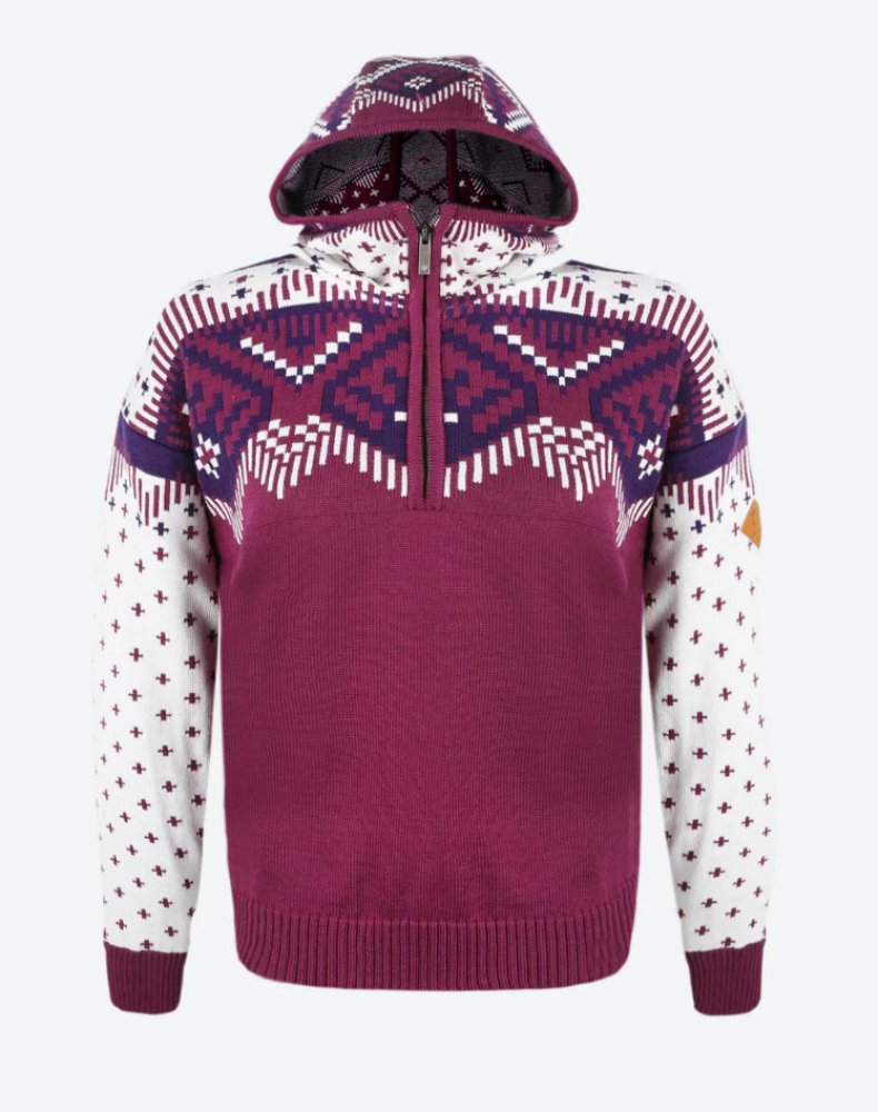 Kama 5057: svetr s odvážným barevným vzorem a kapucí je upletený z velmi kvalitní směsové příze. Střih je volnější, rovný, s rovně nasazenými rukávy.