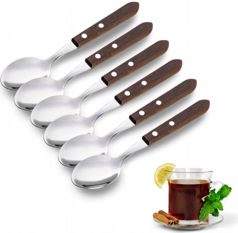 Sada 6 čajových lžiček z z nerezové oceli s dřevěnými rukojeťmi KAMILLE KM-5274⭐ Sada 6 čajových lžiček Kamille s dřevěnými rukojeťmi – styl a pohodlí ve vaší kuchyni!
