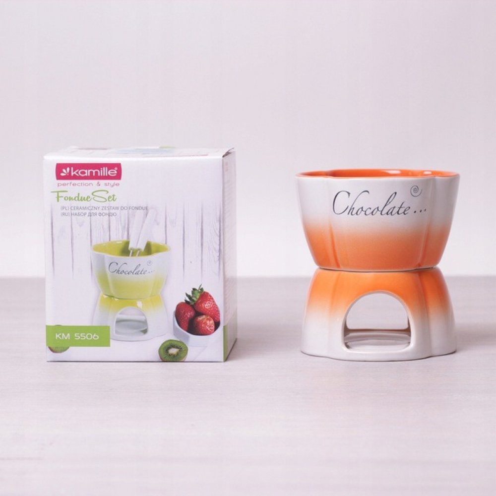 Sada pro přípravu fondue Kamille je vyrobena z keramiky, vidličky z nerezu a plastu. Sada se skládá z misky a stojanu.
