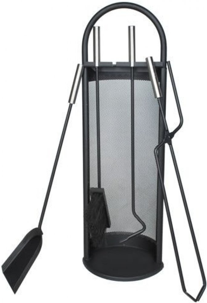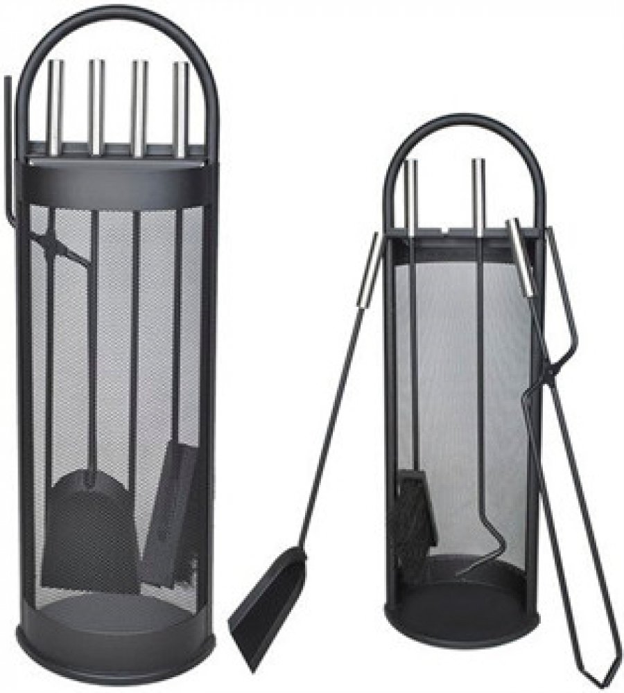 Moderní design pěti dílné sady krbového náčiní, kde každý doplněk má své místo.