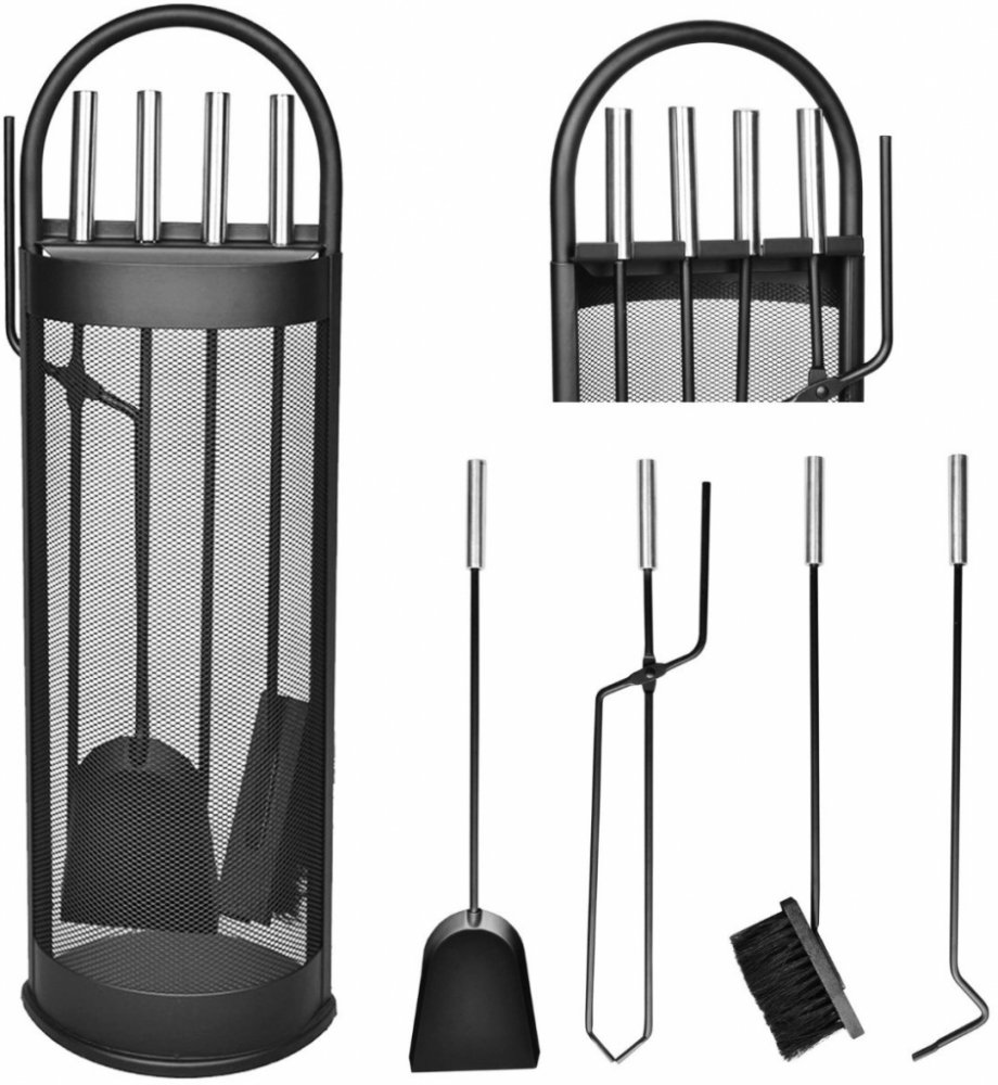 Sada 5 ks krbového náčiní s moderním designem. Odolný, vyrobený z oceli a snadno se používá. Stojánek zachytí nečistoty s nářadí a udrží Váš domov čistý. Kryt chrání příslušenství před jiskrami z krbu. Tvar stojanu vám umožní ušetřit místo. Praktické madlo na krytu umožňuje pohodlné přenášení boxu na nářadí. Rozměr: 66x22 cm.