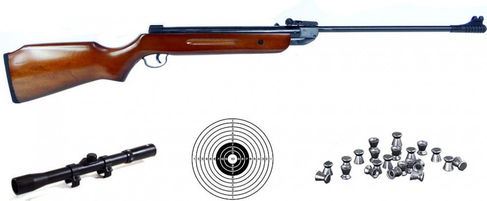 Vzduchovka B2 v setu s puškohledem, diabolkami a terči. Ráže 4,5mm. Spolehlivá jednoranná pružinová vzduchová puška s manuální pojistkou. Je vhodná pro praváky i leváky, zalamovací nabíjení.