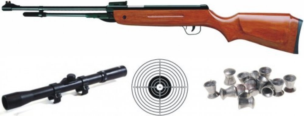 Vzduchovka Kandar B3 + puškohled + diabolky + terče, ráže: 5,5 mm. Spolehlivá pružinová vzduchová puška se spodním nátahem. Režim střelby přebíjení. Střelivo diabolky nebo broky, ráže 5,5 mm.