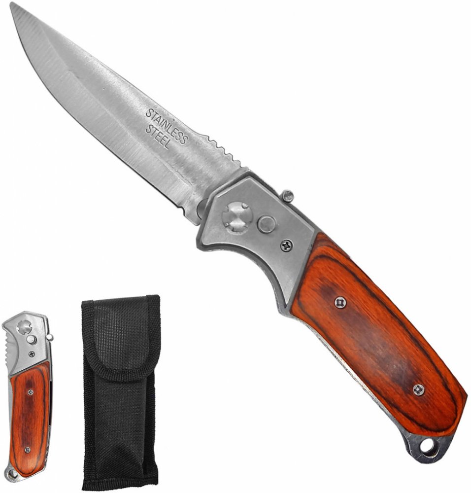 Jádro rukojeti tvoří opět nerezová ocel, na níž jako finální vrstva sedí nerezová příložka ve vrchní části, spolu v příjemné kombinaci s lepeným dřevem, které poskytuje rukojeti nádhernou kresbu s kontrastem ku leštěné nerezové oceli. Nůž je vybavený pevnou pojistkou a tlačítkem pro vystřelení čepele. Díky kvalitní pojistce však máte plnou kontrolu nad otevřením tohoto nože a nemusíte se obávat nechtěných nehod. :)