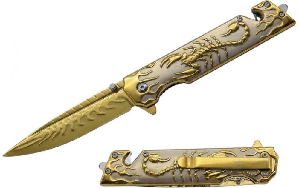 Tento kovový zavírací poloautomatický nůž Kandar v luxusním zlatém provedení je zdoben výrazným motivem zlatého štíra, který symbolizuje sílu, ochranu a odolnost. Díky svému originálnímu vzhledu je vhodný nejen pro každodenní použití (EDC), ale také jako sběratelský kousek nebo stylový dárek.