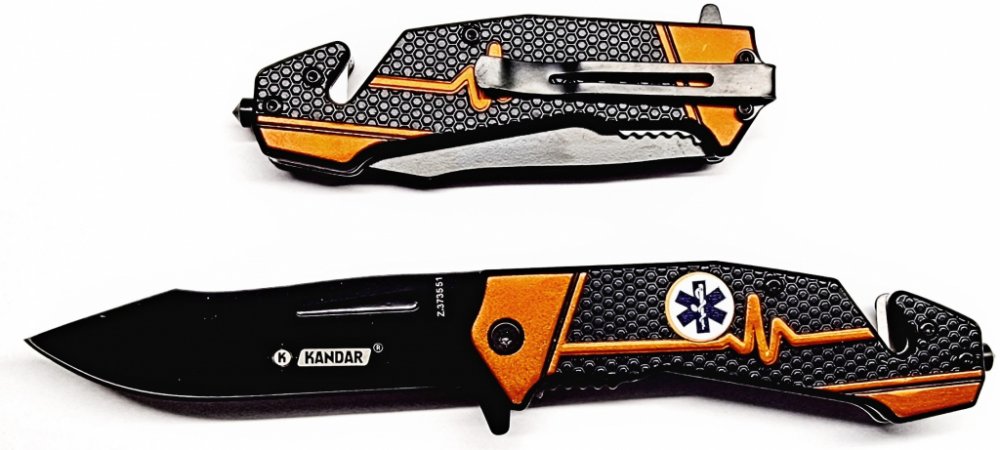 KANDAR N-49 je značně rozměrný, ale zároveň překvapivě lehký, poloautomatický záchranářský nůž, jehož specifickou estetiku podtrhuje kompozice dominantní černé s jasně oranžovými prvky rukojeti. Jeho relativně nízká hmotnost je výsledkem výroby opláštění rukojeti z lehkého, ale odolného hliníku a ne z mnohem těžší oceli. Tento nůž skvěle padne do ruky - je nejen krásný, ale také velmi praktický.