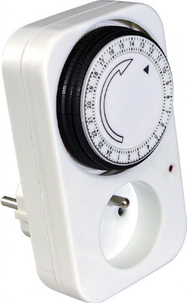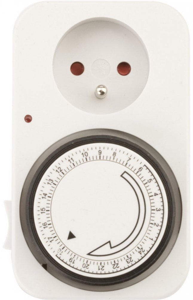 Časový spínač pracuje v denním režimu, doba zapnutí/vypnutí je 15min, časový spínač vybaven funkcí stálého sepnutí