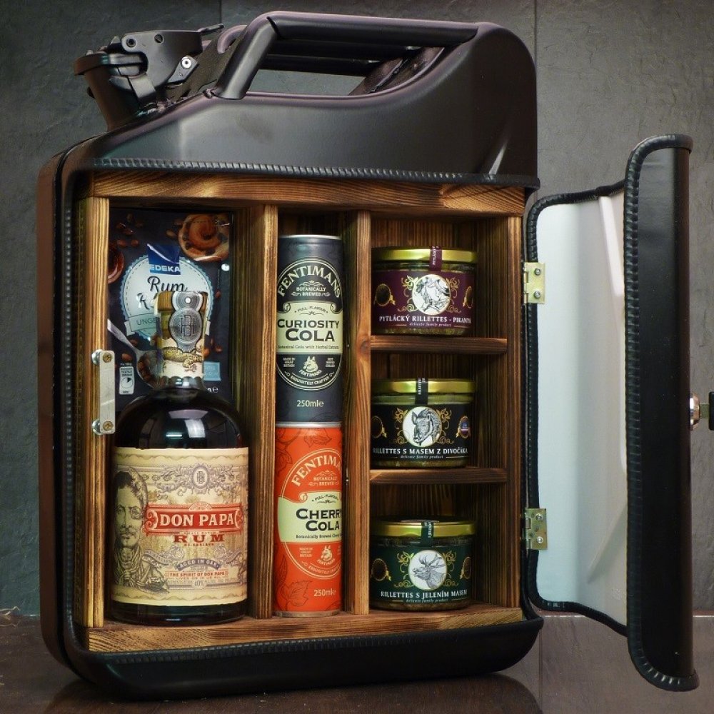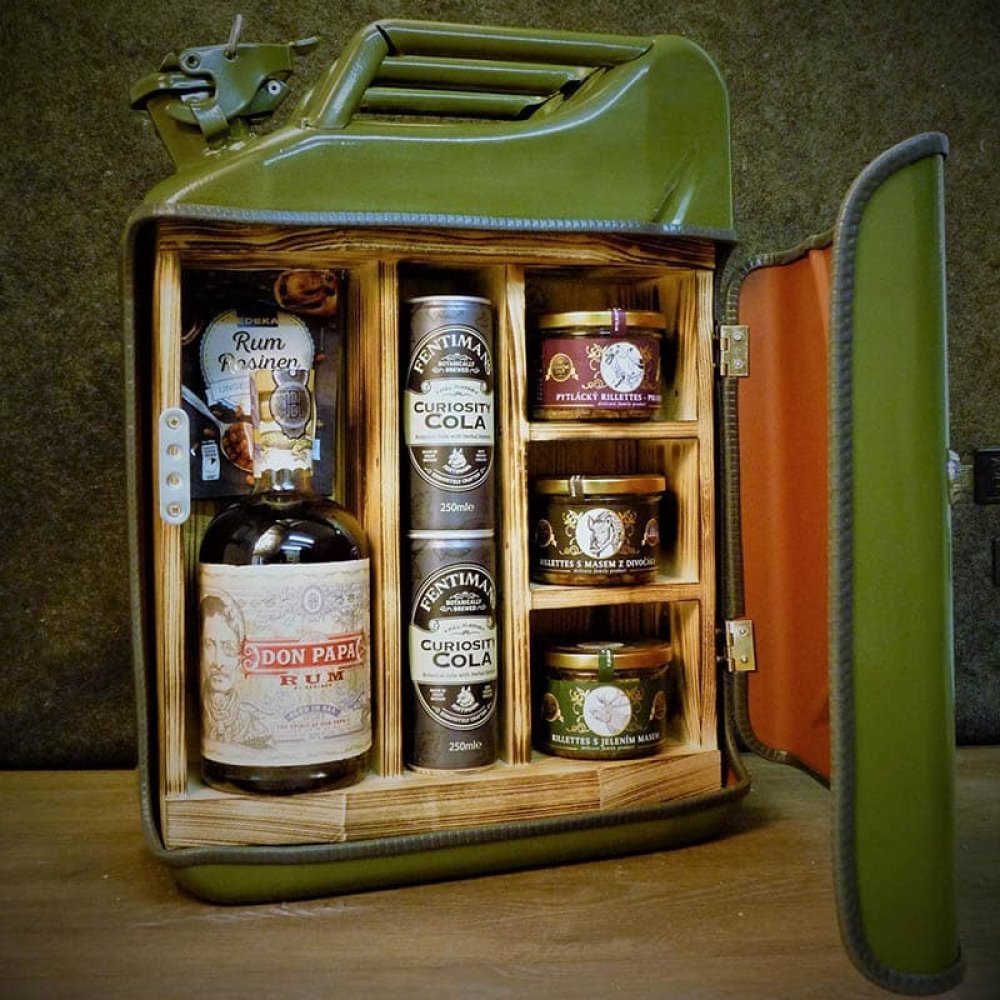 Velice se omlouváme, z důvodu nedostupnosti Fentimans Cherry cola bude náhrada Fentimans Curiosity cola nebo 2x Simply cola organics Redbull Tropická láska, kterou můžete vzít kdekoliv s sebou Občas to chce jednoduše zvednout kotvu a vydat se vstříc novému dobrodružství. Přesně pro takové případy jsme navrhly náš speciální Kanystr bar Don Papa, který si můžete vzít všude s sebou a vždy vám bude dělat toho nejlepšího společníka. Kanystr bar je vyrobený poctivýma českýma rukama a vymyšlený do posledního detailu. Po boku starého dobrého Dona ale nezůstanete sami, na cestu jsme vám přibalili i celou řadu dobrot, které podtrhnou chuť melaninového rumu a postarají se, abyste neumřeli hladem! Kvalita & design Kanystr bar od Bombaboxu není žádný krám, ale opravdu poctivý armádní kanystr o objemu 20l. Svůj obdiv si zaslouží hlavně pro svou výplň, která je navržena tak, aby vyhovovala každému milovníkovi dobré whiskey. Kanystr bar je vyložen kvalitním dřevem se speciálním ošetřením pro dlouhou životnost a rozdělen do několika barevných variant, díky kterým si svého favorita najdete i vy! Speciality Kanystr baru Don Papa Don Papa ,7l (40 % alkoholu) – rum nasáklý opravdovou tropickou atmosférou, která je skladována v dubových sudech až sedm let! Nasládlá chuť je doplněna o tóny vanilky, medu a kandovaného ovoce. Fentimans Cherry cola 250ml – ochutnejte originální recepturu bez použití chemie! Ano, tenhle kolový nápoj s vůní třešní je totiž vyrobený pomocí fermentace, která probíhá v dřevěných kádích po dobu sedmi dní! Fentimans Curiosity cola 250ml – kořeněný kolový nápoj s vůní bylin a zázvoru! Stejně jako jeho kamarád Fentimans Cherry cola i tento sladký zázrak se vyrábí bez chemie a za použití fermentace! Edeka rozinky 125g – luxusní rozinky zrající v pravém jamajském rumu! Velké, šťavnaté a zaručeně návykové! Vineco – Rillettes 180g (pikantní) – poctivá česká paštika s výraznou vůní divočiny. Spolu se špetkou chilli, mandlemi a červeným vínem zaujme svou pikantností a výraznými chutěmi v každém soustu. Vineco – Rillettes 180g (divočák) – poctivá česká paštika s výraznou chutí trhaného masa, která v kombinaci s rozinkami, mandlemi a červeným vínem dává dohromady opravdu luxusní zážitek. Vineco – Rillettes 180g (jelen) – jedinečná česká paštika s poctivou chutí zvěřiny. V kombinaci s mandlemi, brusinkami a červeným vínem vytváří nevšední zážitek, který uspokojí všechny vaše chuťové buňky.
