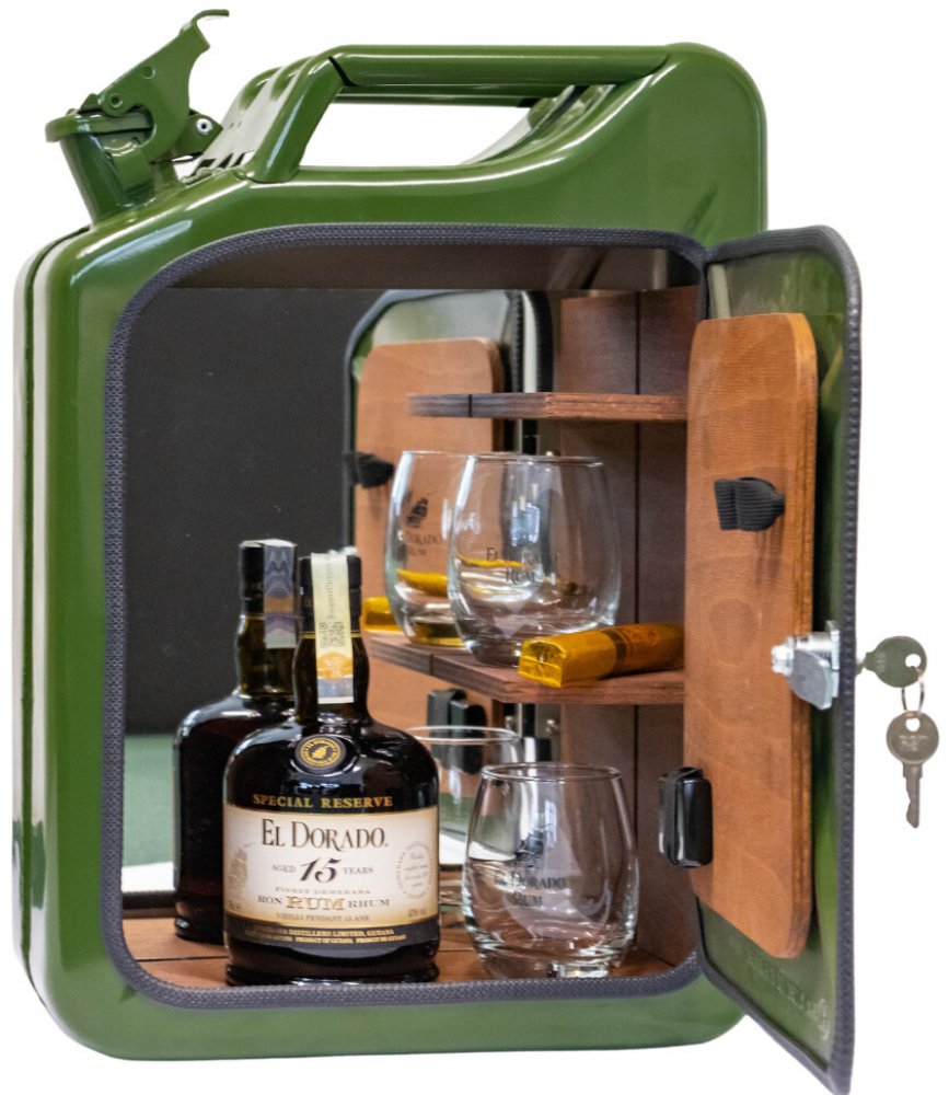 Kanystr s alkoholem je naplněn prémiovým produktem El Dorado 15y. Je míchán ze speciálně vybraných letitých rumů. Jedná se o rum s nádhernou barvou s atraktivním měděným odstínem, komplexní vůní třtinového cukru, banánu a cedru, v chuti hebký nástup přechází k mírně plnému a sytému tělu, krásně úměrný a určený pro dlouhé hloubavé usrkávání. V bar kanystru najdete také držák kanystru pro montáž na zeď, 2 originální sklenice El Dorado, zapalovač a doutník značky Perdomo Reserve 10th Anniversary Robusto Connecticut.