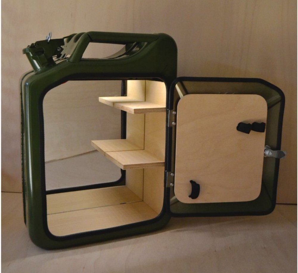 Tento bar se pyšní naprosto jedinečným designem, který mu vdechl 20 l vojenský kanystr z kterého je zhotoven. Vnitřek kanystru je osazen překližkou v kombinaci se zrcadlem, které mu dodává správný barový nádech.