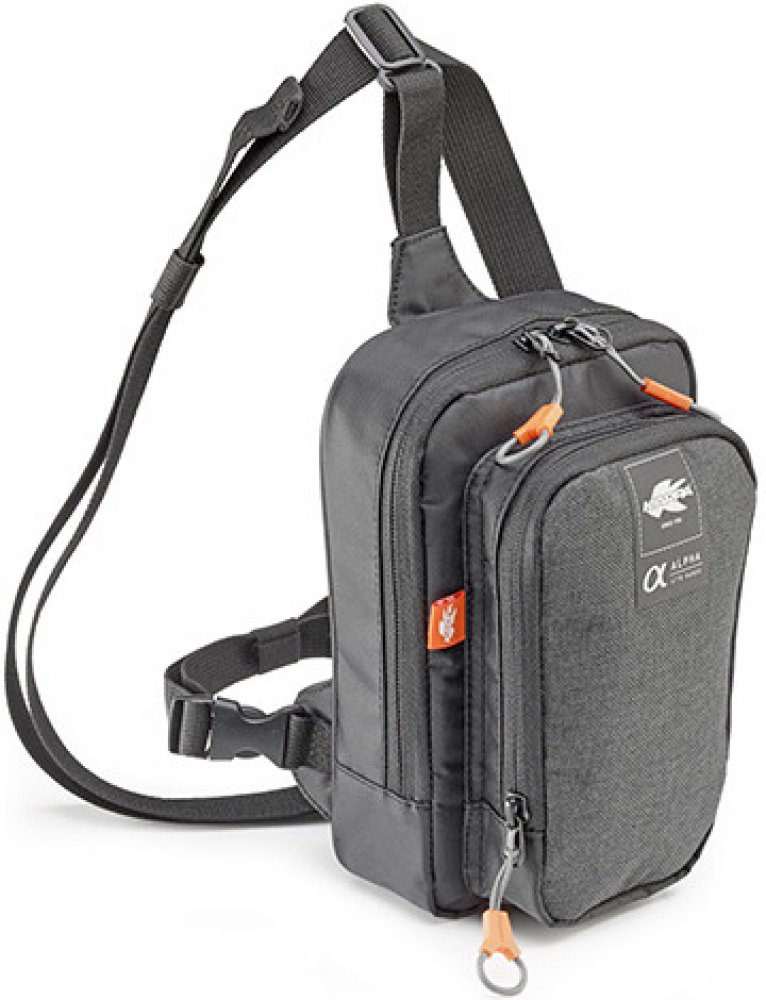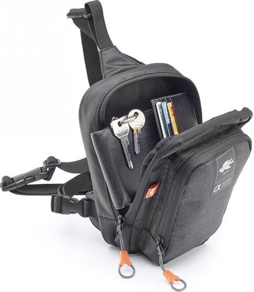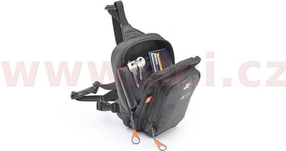 Stehenní taška pro motorkáře Kappa s upevněním na nohu a kolem pasu s pomocí nastavitelných popruhů.