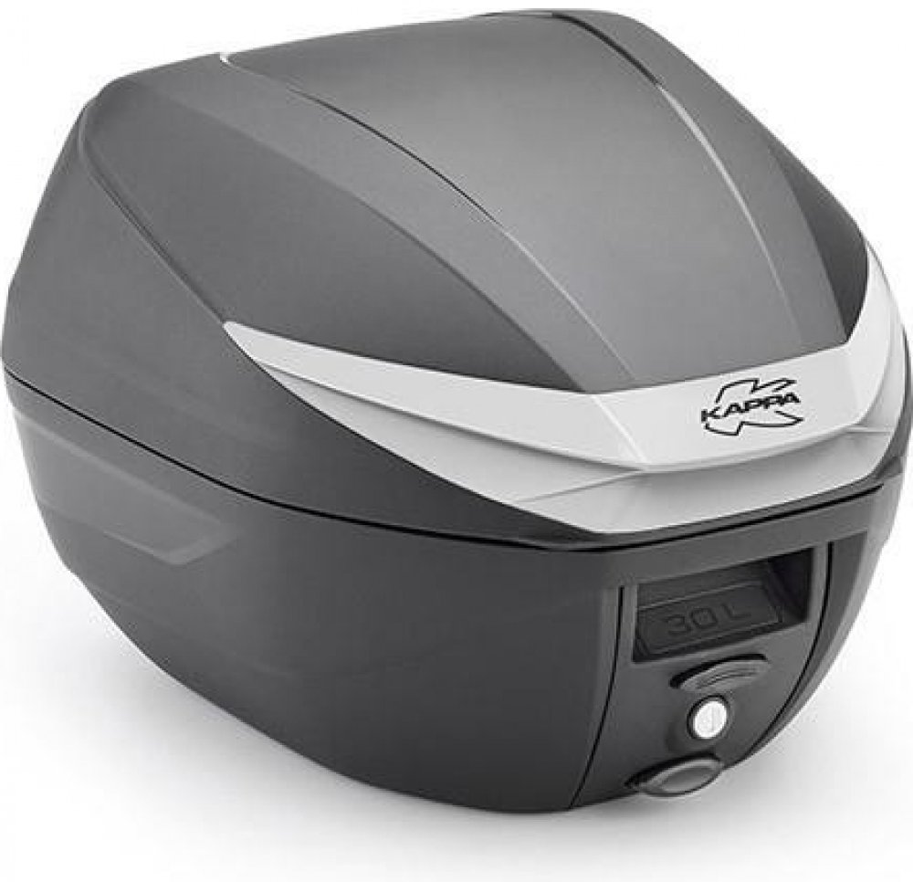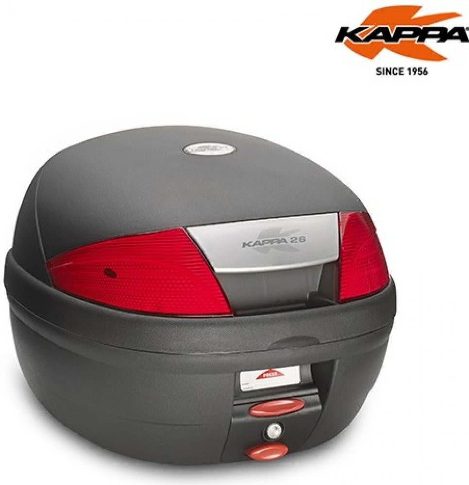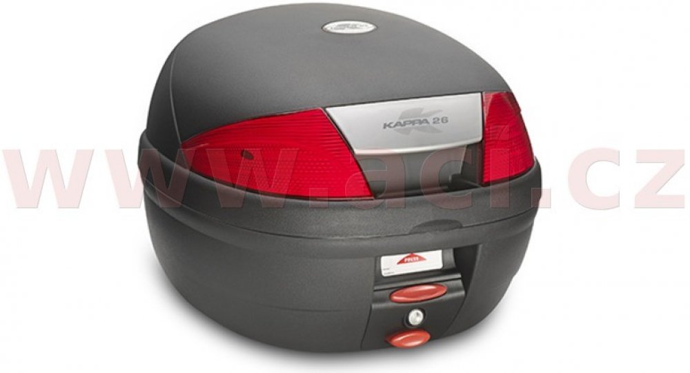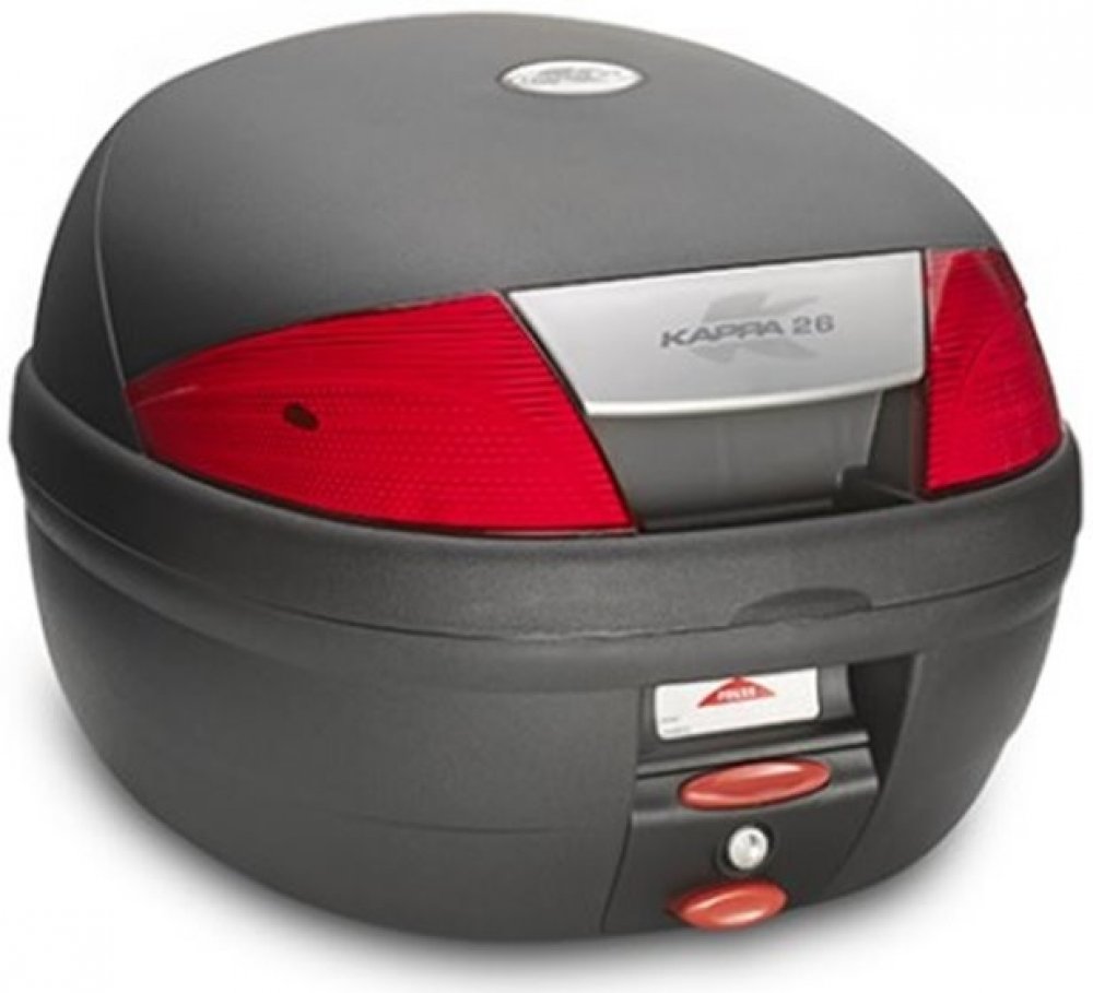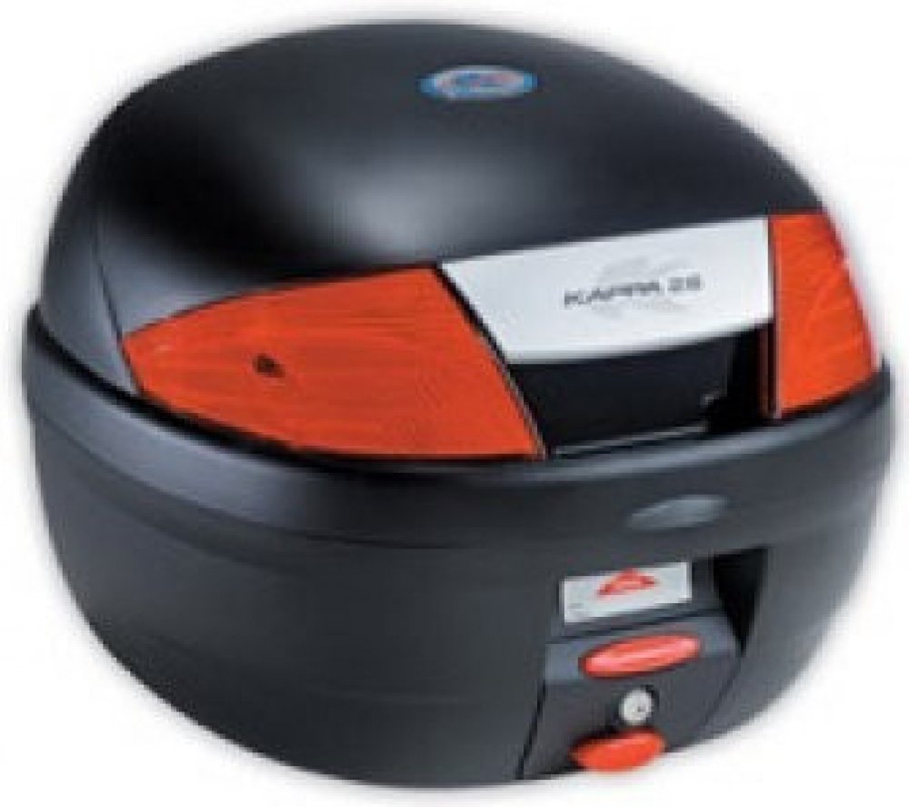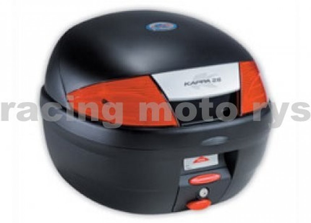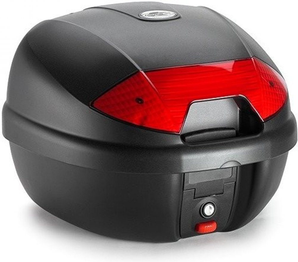 Kufr typu Monolock s plotnou. objem 26 litrů, nelakovaný, 2 velké červené plexi, na 1 integrální helmu, zamykání na klíček, součástí universální plotna, 38 x 30 x 38 cm, váha kufru 3,1 kg, maximální zatížení 3,0 kg, doporučená rychlost motocyklu max. 120 km/h,