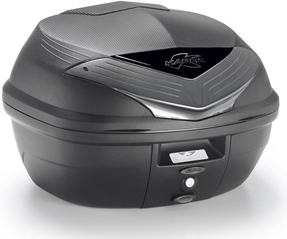 Vrchní motocyklový plastový kufr s uchycením MONOLOCK® o objemu 35 litrů, vybavený tlakovým uzávěrem na víku, s exkluzivní estetikou vyznačující se přítomností kouřového reflektoru lakovaného zevnitř a černou lisovanou středovou deskou.