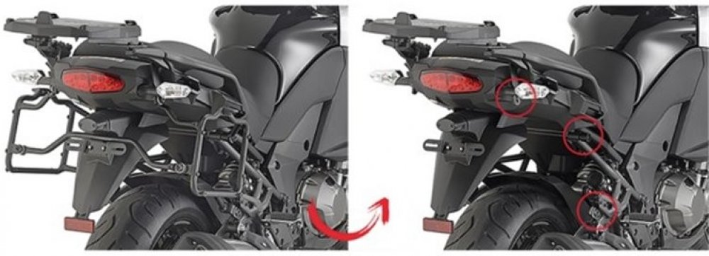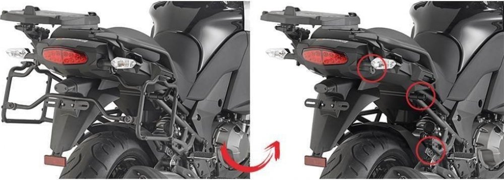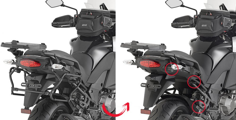 EASY FIT trubkový nosič bočních kufrů, DEMONTOVATELNÝ. Tento trubkový nosič lze snadno a rychle demontovat z motocyklu (a to bez použití nářadí), zbydou jen úchytné trny pro snadnou zpětnou montáž.