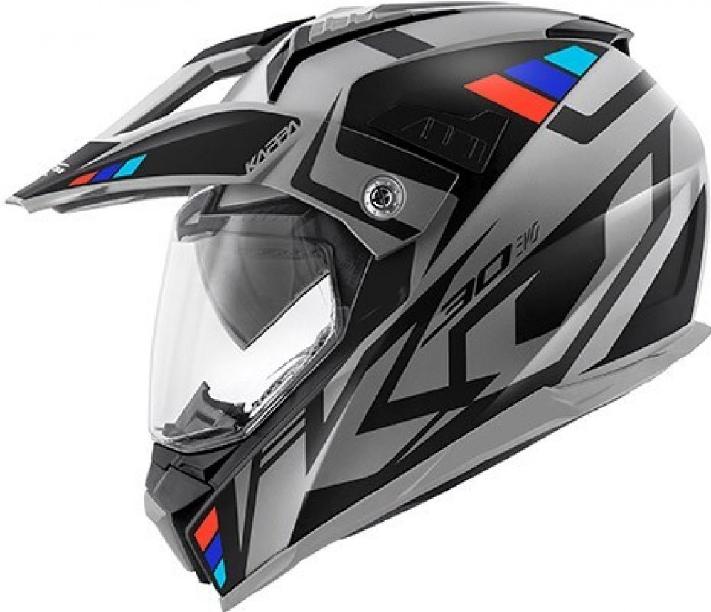 Universální endurová přilba KAPPA. barva šedo-černá mat, materiál termoplast, vnitřní výsuvná sluneční clona, plně vyjímatelný a pratelný antibakteriální interiér, odnímatelný štítek, velké čiré hlavní plexi s úpravou proti poškrábání, nastavitelné odvětrání na bradě a vrchu hlavy, malý bradový deflektor, váha 1550 +/- 50g CE ECE 22.06