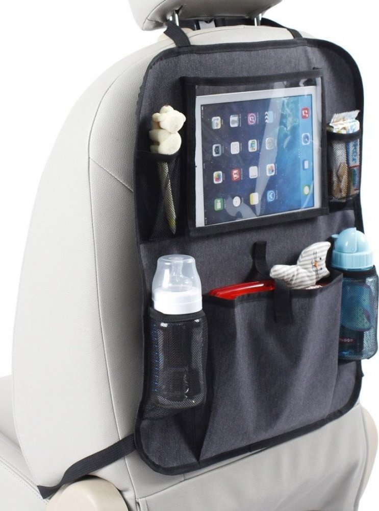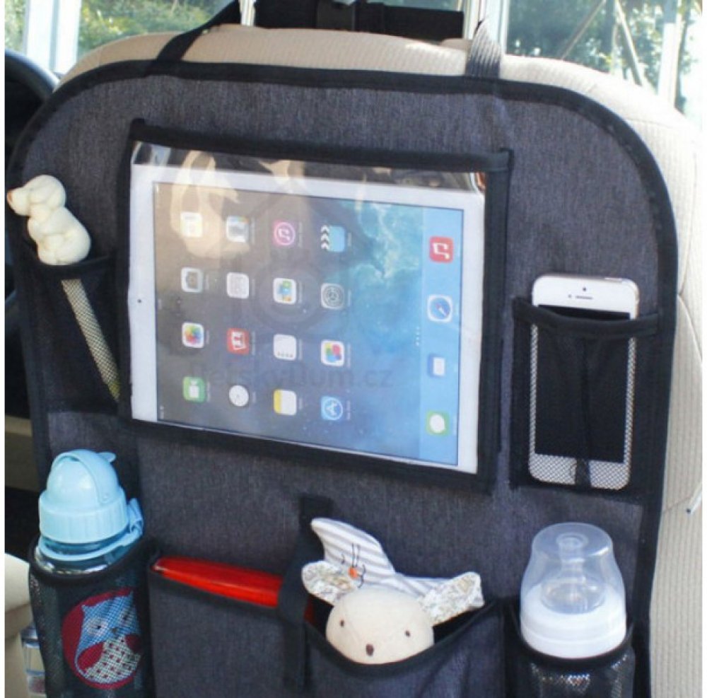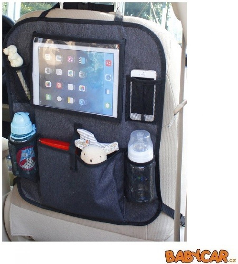 Kapsář do auta s kapsou na tablet chrání potahy vozidla i poskytuje místo pro hračky, nápoje i tablet s mobilním telefonem. Univerzální kapsář na zadní stranu předního sedadla vybavený sedmi kapsami včetně dvou držáků nápojů.
