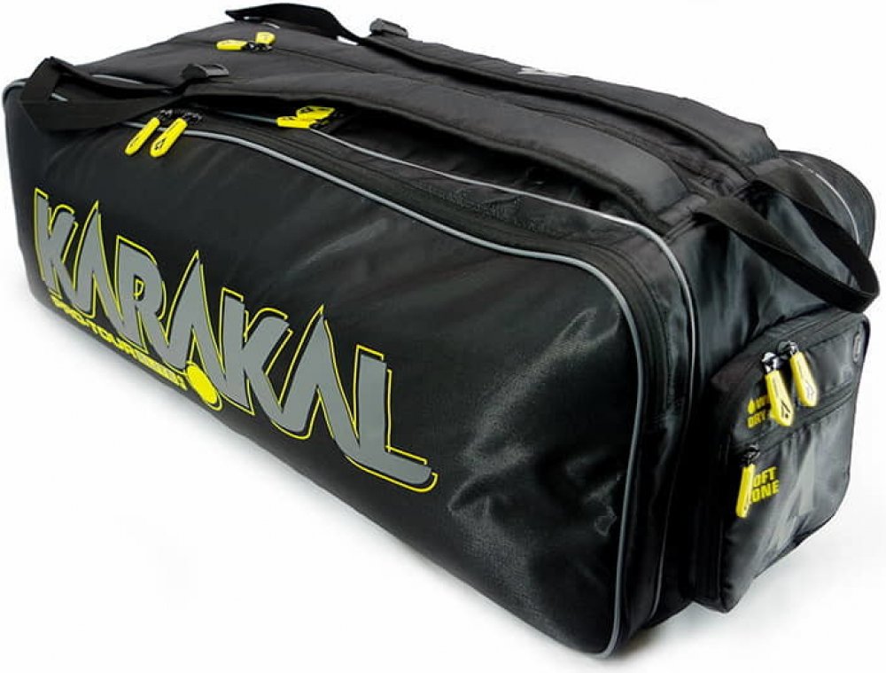objem: 75 litrů Taška pro turnajové hráče na 8 - 16 raket, v černé barvě s šedým nápisem a drobnými žlutými grafickými motivy, tři hlavní oddělení, speciální kapsy na mokré a křehké věci a obuv.