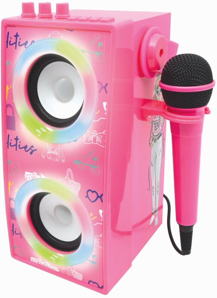 Zpívejte si své oblíbené písničky s reproduktorem Barbie. Zpívejte jako hvězda s opravdovým mikrofonem a použijte vícebarevné LED světla, abyste vytvořili úžasnou atmosféru. Vestavěné baterie zajistí dlouhé hodiny zábavy. Lehká a přenosná konstrukce umožňuje vzít si karaoke vybavení kamkoli. Bude to ideální dárek k narozeninám pro vaše dítě!