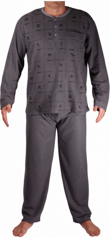Užít si spánek jako v bavlnce? K tomu dokáže významně přispět vhodný noční oděv. Měkké froté pyžamo Karel je velmi příjemné na omak. Navíc podporuje vaši tepelnou pohodu díky použitému materiálu i dlouhým rukávům a nohavicím. Froté pyžamo zateplené Z vnitřní strany s počesem Dlouhé rukávy i nohavice Přední díl trička s potiskem - design potisku se může mírně lišit Zadní díl je hladký a jednobarevný V klopě funkční zapínání na tři knoflíky Na levé straně kapsa o rozměrech cca 14 x 14 cm Kalhoty jsou jednobarevné V pase na pevno všitá guma o šířce 2,5 cm Volné zakončení nohavic i rukávů - bez manžety Vhodné pro muže, kteří chtějí být celou noc v teple Materiálové složení: 65 % bavlna 35 % polyester